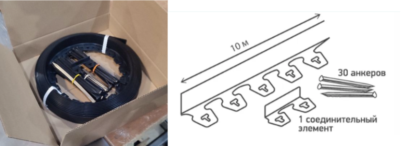 Поставляется комплектом в коробке с соединительным элементом и крепёжными анкерами (30 шт.).
