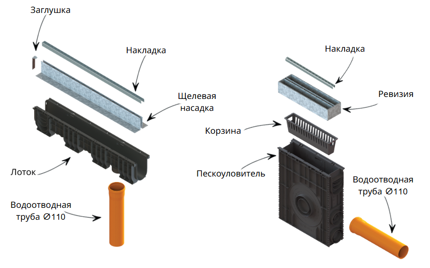 Насадки совместимы со всеми материалами лотков Drive DN100–DN200. Для соединения с пластиковыми, бетонными и полимербетонными лотками серии Drive применяется комплект крепежа: