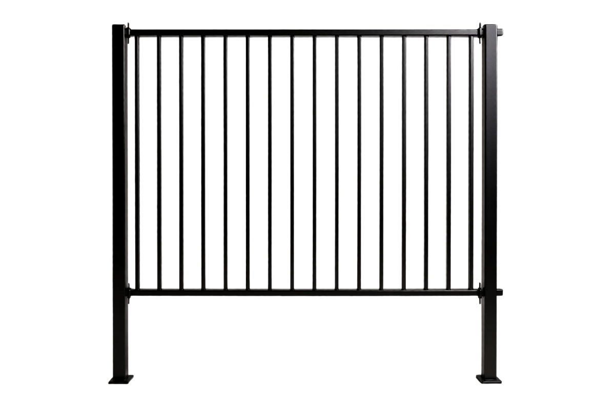 - между стойками закреплены вертикальные прутья (перекладины), равномерно распределённые по всей ширине секции. Прутья имеют одинаковую толщину и высоту, что придаёт ограждению симметричный и аккуратный вид;