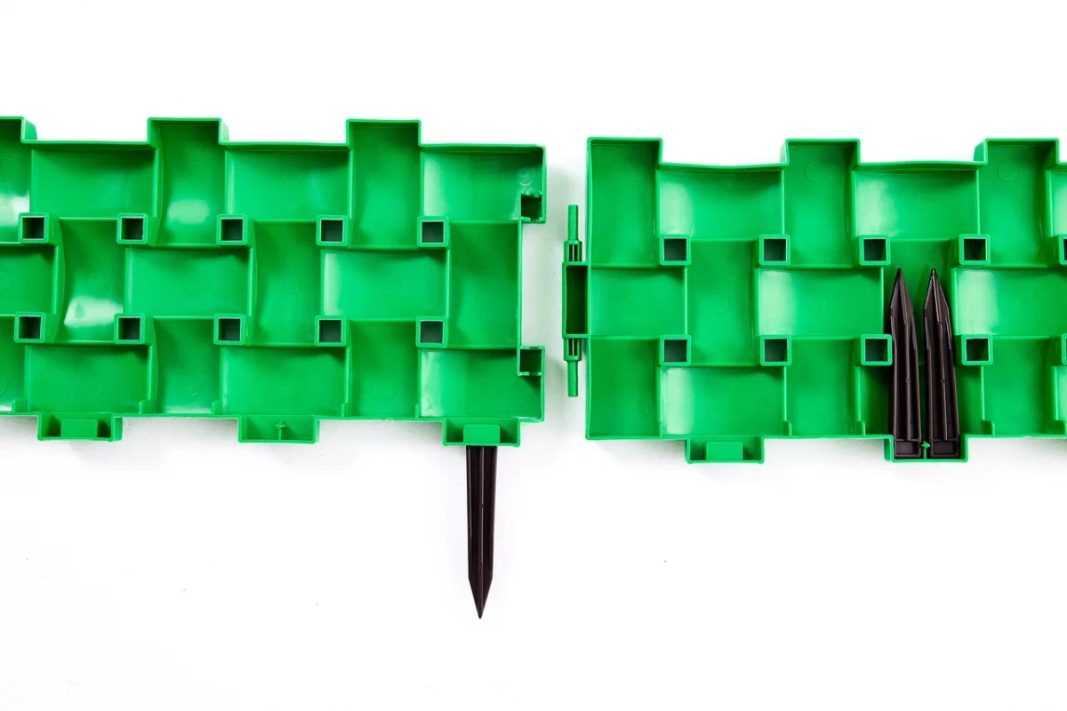 Простая установка не требует специальных инструментов. Секции надежно соединяются между собой пластиковыми замками и фиксируются в грунте при помощи колышков, входящих в комплект.
