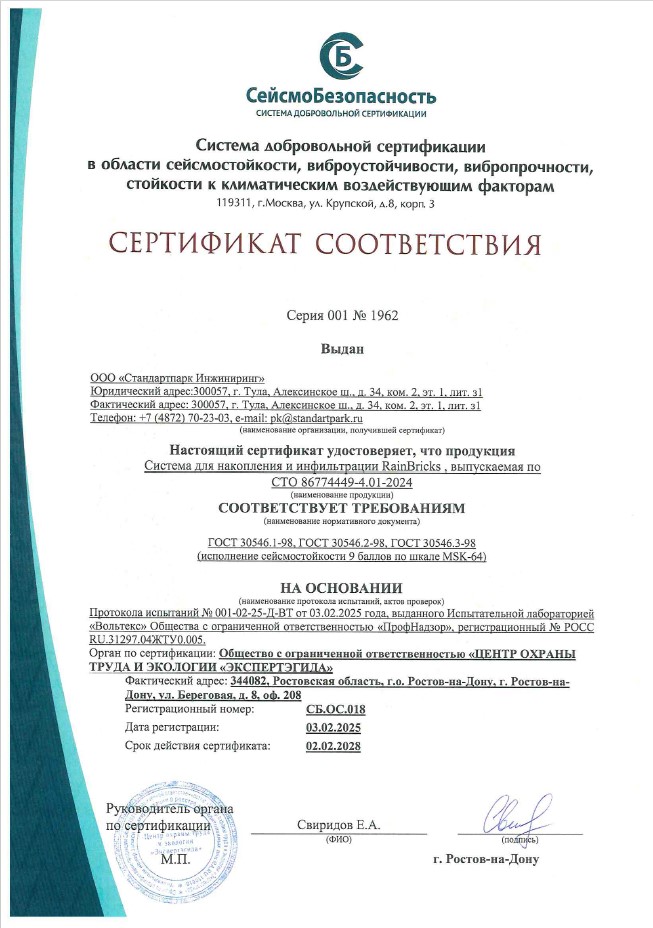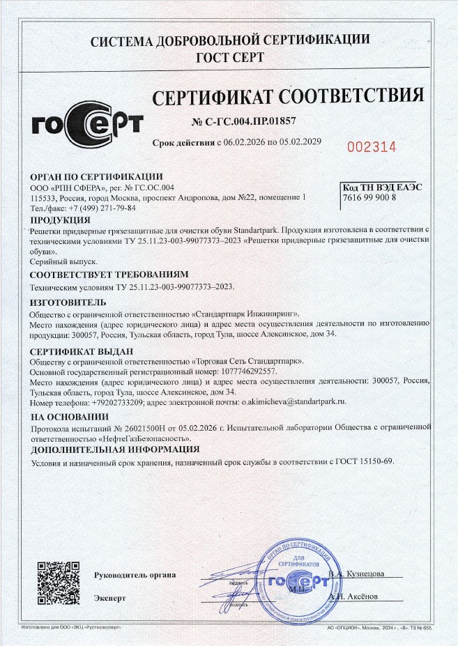 В 2009 году производство Стандартпарк было сертифицировано согласно мировым стандартам ISO 9001. Система управлением качеством продукции, процессов и услуг охватывает планирование, разработку изделий, закупку сырья и комплектующих, анализ и подбор поставщиков, создание и обработку изделий, их доставку, а также обучение персонала.