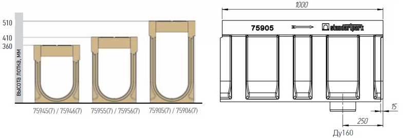Удобная конструкция лотков упрощает монтаж: стрелка на поверхности чётко показывает направление движения воды, позволяя быстро и правильно расставить элементы. Опорные лапы в нижней части гарантируют их устойчивую и надёжную установку и фиксацию в бетонной обойме.