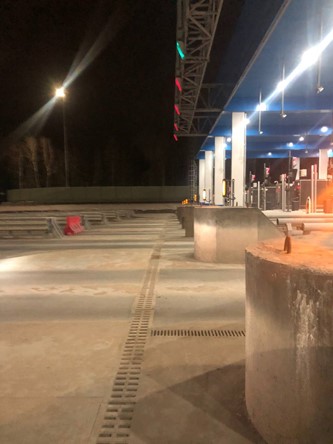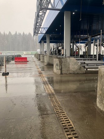 Для водоотведения здесь использовали полимербетонные моноблоки самого широкого сечения DN300. Они имеют высокую пропускную способность, что важно на данном объекте, так как ливневые стоки необходимо отводить и с земли, и с кровельного водоотвода. Линия водоотведения укомплектована ревизионными пескоуловителями с чугунной решеткой, для сбора мусора и удобной эксплуатации.