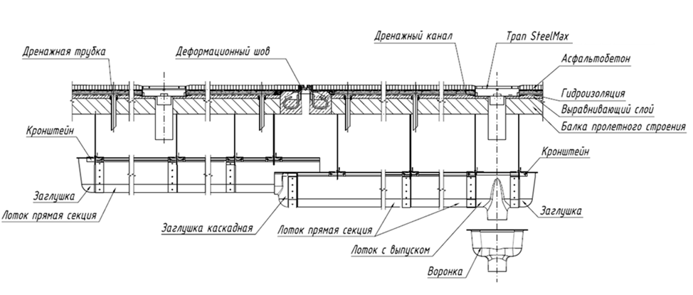Конструктивно подвесной водоотвод делится на два подвида – классические подвесные системы, используемые совместно с трапами SteelMax и фасадные системы, размещаемые на торце пролетного строения и собирающие сток подобно водоотводу со скатных крыш.