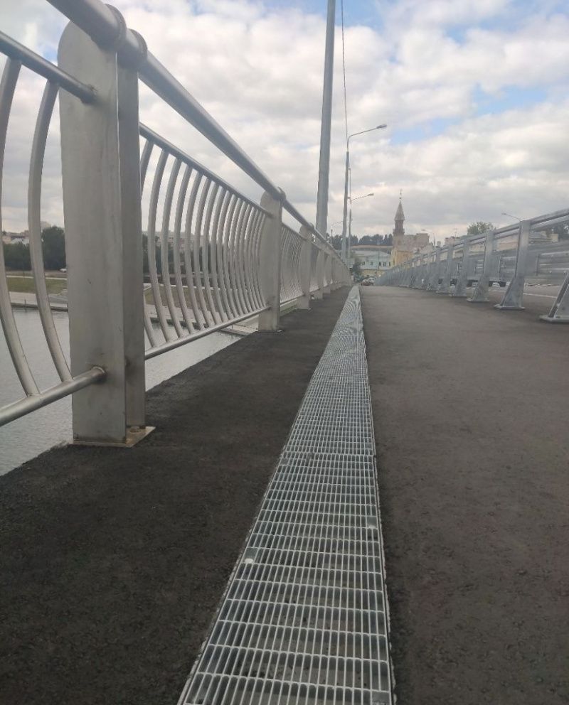 На Бакунинском мосту, расположенном в городе Пенза, реализован комплекс мероприятий по организации точечного водоотвода. В проекте использован дождеприемник ДМ-2, обеспечивающий локальный сбор воды, а также установлен тяжелый чугунный люк типа Т, отличающийся высокой прочностью и износостойкостью, а также линейный мостовой водоотвод. Такое инженерное решение гарантирует стабильную эксплуатацию при высоких нагрузках и защищает несущие конструкции моста от разрушения, вызванного обилием осадков и воздействием агрессивных сред.